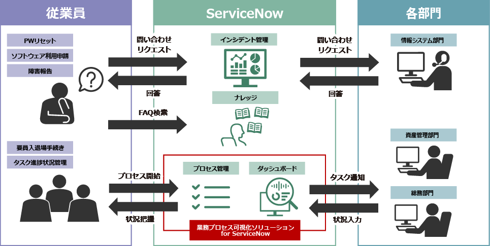 また、日立ソリューションズ独自開発の「業務プロセス可視化ソリューション for ServiceNow」をセットで提供することで、社内のさまざまな業務プロセス管理に活用することが可能です。