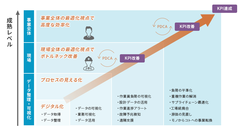 製造業の幅広い業務・課題に対応する豊富なラインアップ。IoTやAI、ビッグデータ・クラウドなど、最新のデジタル技術だけでなく、全体最適という視点でご提案します。