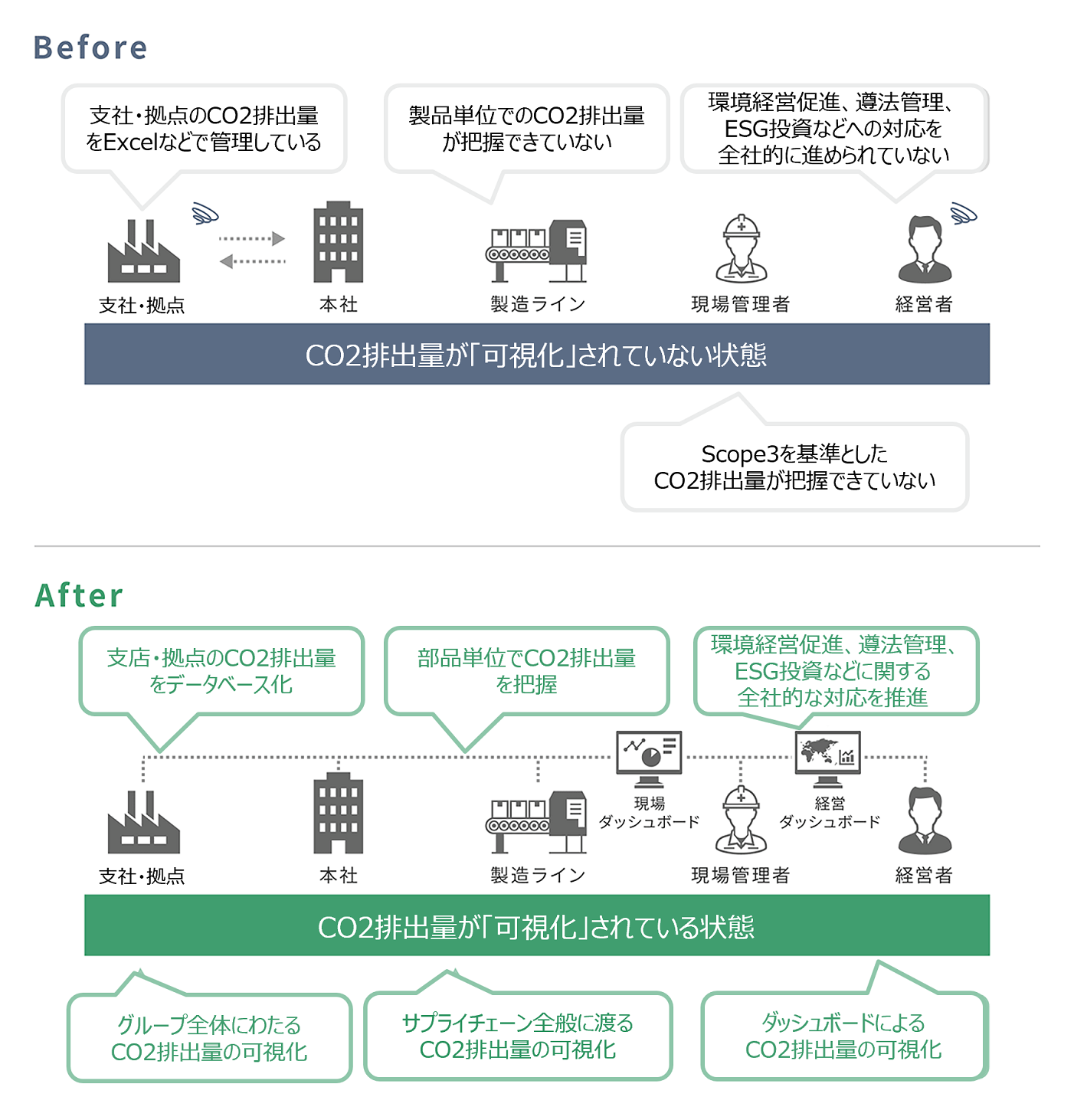 - 取引先別、工程別、設備別、輸送ルート別でのCO2発生量を可視化