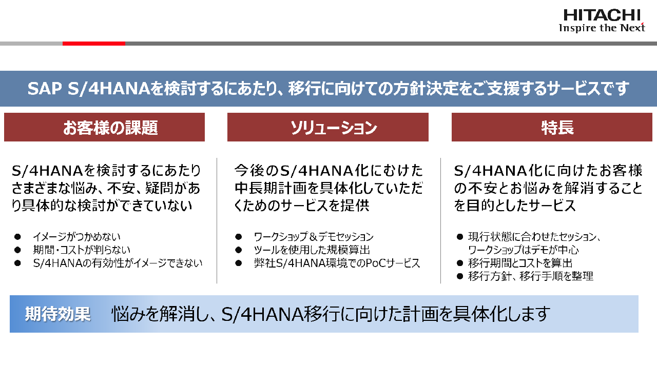 竹下:SAP S/4HANAの場合、前身のSAP ERPからの移行にお悩みのお客さまも多く、そのようなお客さまには移行アセスメントサービスをお勧めしています。ワークショップやデモセッション、ツールを使用した予算規模の算出、当社のSAP S/4HANA環境でのPoCサービスなどを通じて、導入にかかる期間やコストを具体的に算出し、SAP S/4HANA導入の方針、手順などを整理・理解していただけます。