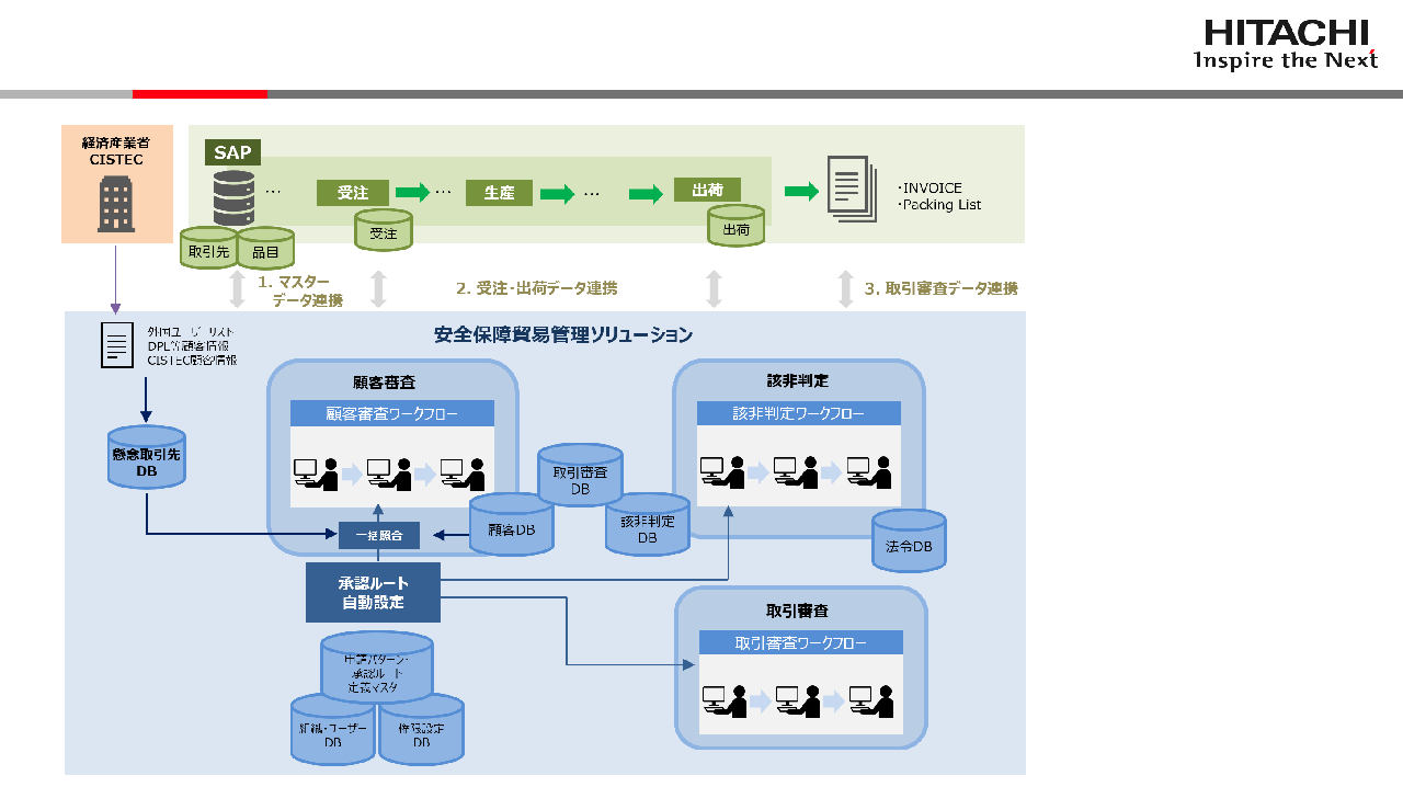まず安全保障貿易管理ソリューションとは、引き合いから出荷業務までの過程において、全社・全部署で一貫性のある基準、統一手順で各審査業務が行えるソリューションです。 |
