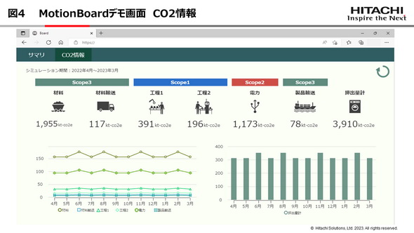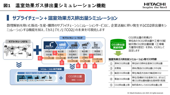 日立ソリューションズが提供する「グローバルSCMシミュレーションサービス」には、CO2排出量予測に基づく販売/生産戦略の最適解を提案する機能がある。現在、GHG(温室効果ガス)プロトコルにおいてサプライチェーン上のCO2排出量を含めるとしたスコープ3への対応に悩む企業も多いが、こうした課題に対応する。