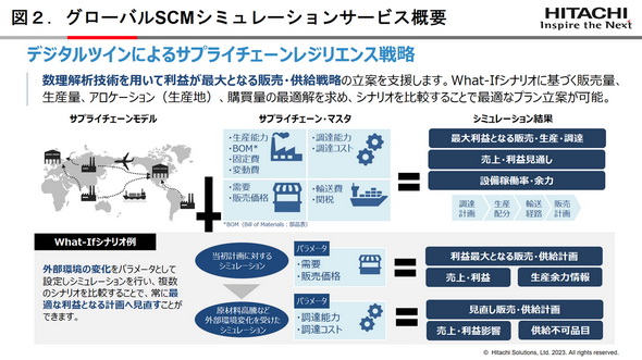 グローバルSCMシミュレーションサービス自体はもともと2020年にリリースされた。現実のサプライチェーンのデータに基づいたモデルをデジタルツインとして展開し、数理解析技術を用いてシミュレーションを行う。これによって、利益が最大となる販売/生産戦略の立案を支援するソリューションとして提供してきた。