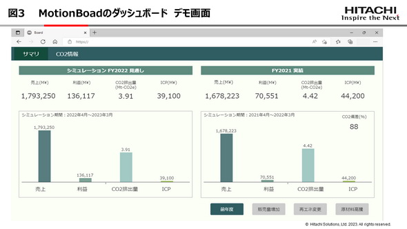 そのうえで特徴は大きく分けて2つある。1つは「販売生産計画や施策に対するCO2排出量のシミュレーション」が行えることだ。当年度の販売計画などの未来の計画に対して、排出されるCO2量をあらかじめシミュレーションできる。これにより「CO2排出量の削減に向けた取り組みの進捗の確認や、設備やサプライヤー変更によるCO2排出量削減の効果が評価可能です」(小沢氏)という。