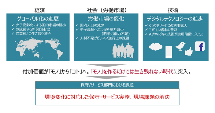 国内製造業を取り巻く環境は大きく変化しています。経済面では、少子高齢化により国内市場は縮小し、一方で新興国市場は急成長しておりターゲットとするマーケットの変更を余儀なくされています。また、国内市場の縮小により市場を失った異業種が、業種の壁を越えて製造業の領域に参入してきており、 製品力/サービス力の競争は激しくなる一方です。社会とくに労働市場に目を向けると、熟練工の退職に代表されるように製造業においても少子高齢化による労働力減少が顕在化し、人材不足がビジネス遂行上の最大の課題となっています。