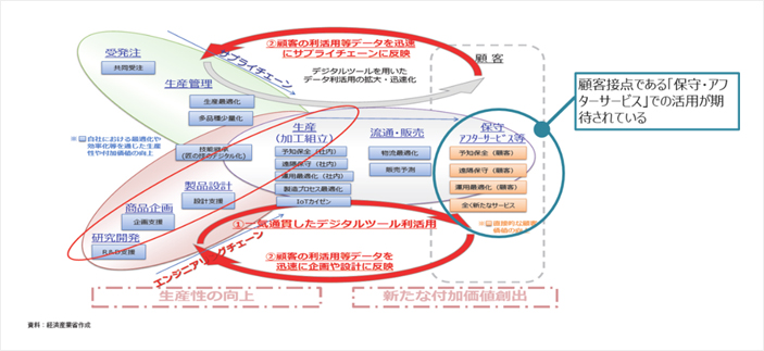 デジタルテクノロジーの進歩に合わせ、製造業においてもAIやIoTをはじめとしたデジタルツールの利活用が期待されています。その中でも、直接的な顧客価値の向上につながる保守・アフターサービスの領域で期待が高まっています。保守・アフターサービス領域では、IoTを活用した予知保全、ウェアラブル/クラウドサービスを活用した遠隔保守、サービタイゼーション(製造業におけるサービス化)に代表されるまったく新たなサービスが、デジタルツール利活用の一般的な事例といえます。