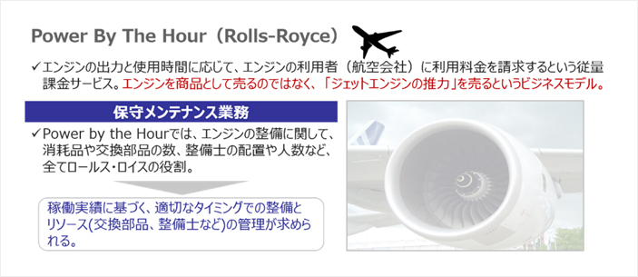ロールス・ロイス社の航空エンジン部門では、航空エンジンを売るのではなく、エンジンの出力と使用時間に応じて利用者(航空会社)に利用料金を請求するという従量課金サービス、言い換えれば「ジェットエンジンの推進力を売る」というビジネスモデルを展開しています。サービタイゼーションの有名な事例ですが、収益を出すためにはいかに効率的な保守メンテナンス業務を行うかがポイントになると考えます。なぜならば、サービタイゼーションでは、提供している機器の整備に関しては、サービス提供元の役割になるからです。サービタイゼーションを実現しているロールス・ロイス社では、IoTを活用し、航空機の飛行履歴、エンジンの稼動実績を記録・可視化し、適切なタイミングで、適切な場所に整備士を配置し、効率的なメンテナンスを実現しています。
