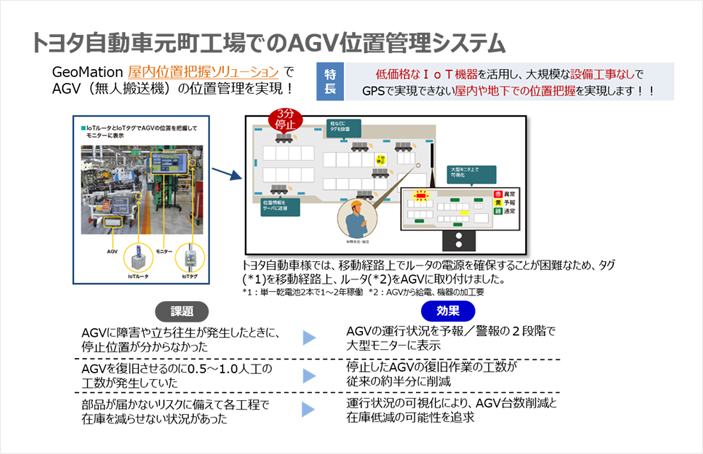 次に、日立ソリューションズがトヨタ自動車元町工場で実施した、IoTを活用した先進的な取り組み事例を紹介します。トヨタ自動車元町工場では、広大な工場内を走り回るAGV(無人搬送車)について、「障害や立ち往生が発生したときに、停止位置がわからない」「AGVを復旧させるのに0.5から1.0人工の工数が発生していた」「部品が届かないリスクに備えて各工程で在庫を減らせない」などの課題を抱えていました。これら課題を解決するために、日立ソリューションズは、低価格なIoT機器を活用し、大規模な設置工事無く、GPSでは実現できない屋内や地下での位置把握を実現しました。IoT機器を利用しAGVの運行状況を予報/警告の2段階で大型モニターに表示することで、停止したAGVの復旧作業工数の削減、AGV台数削減と在庫低減の可能性を追求しています。