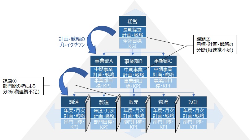 また、サプライチェーンは調達・生産・物流・販売などの複数の組織が密接に関係し、その実現を困難にする要因となっている。その中で、各部門がボトムアップでバラバラのKPIを設定し改善活動を進めると個別最適が進み、全社目標との整合が薄れてしまうことにつながる。この状況に陥ると戦略に基づく全体最適の意思決定が取れなくなり、変化への対応がますます遅れてしまうことにつながる。部門間の壁や上下関係の壁を意識し、忖度するあまり、大きな改善が見込める施策を後回しにしていることはないだろうか。問題をオープンにせず、現場のすり合わせにより、解決に取り組むことが美徳とされている文化の会社も多い中で、上記を実行するのが難しいのは理解ができる。