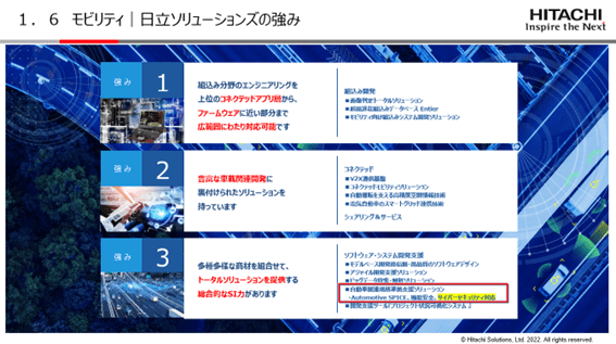 また、機能安全やAutomotive SPICE、サイバーセキュリティ規格などへ対応するためのプロセス構築支援やコンサルティングサービス、アセスメントサービスを提供する自動車関連規格準拠支援ソリューションを用意。新海は「組み込み分野の開発経験を生かした開発支援や、最先端技術を活用した幅広い開発環境とツールの提供など、多種多様な製品・サービスを組み合わせ、トータルソリューションを提供する総合的なSI力が当社の強みです」と強調しました。