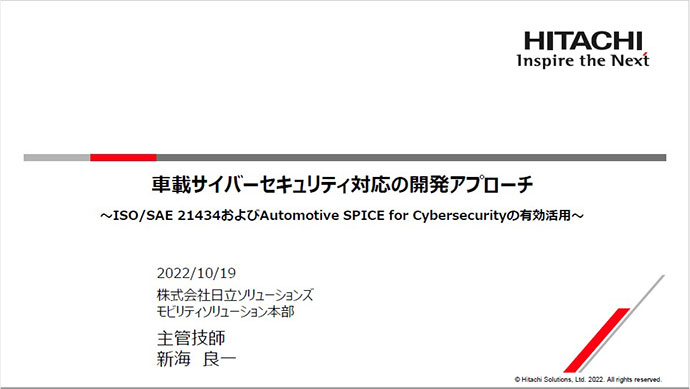 自動運転などの技術が進化する一方、サイバーセキュリティリスクに対応した車の開発が求められています。本セッションでは、自動車のサイバーセキュリティに関する国際規格ISO/SAE 21434および業界での開発モデルのデファクトスタンダードであるAutomotive SPICE for Cybersecurityの特徴や、開発者の立場に応じた活動を進めるためのアプローチについて解説しました。