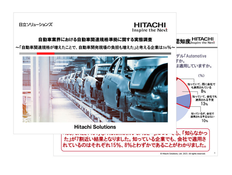 実態調査にて、開発モデル「Automotive SPICE®」を知っているのは45%という結果に。そのほか、安全規格の適応についての課題、規格増加による開発現場の負担の状況、規格対応のために構築・改善に関わる人員体制、規格対応のためにサポートしてほしいことなどを調査したレポート結果をダウンロードいただけます。
