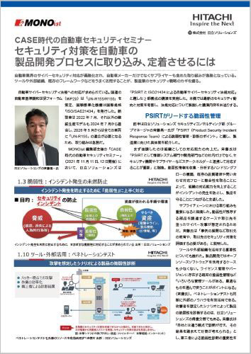 セキュリティ対策を自動車の製品開発プロセスに取り込み、定着させるには2021年11月にWebセミナー「CASE時代の自動車セキュリティセミナー」が開催されました。講演レポートをダウンロードいただけます。