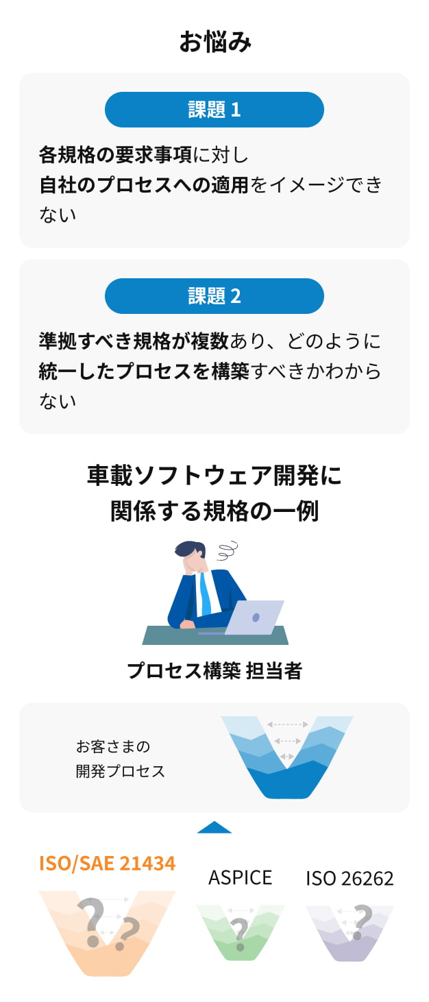 プロセスの構築から運用効率化まで、自動車業界での車載ソフトウェア開発経験豊富な体制で支援。