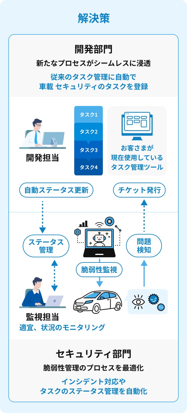 開発部門は従来のプロセス上でセキュリティ対応を実施でき、セキュリティ部門は業務を自動化・効率化。