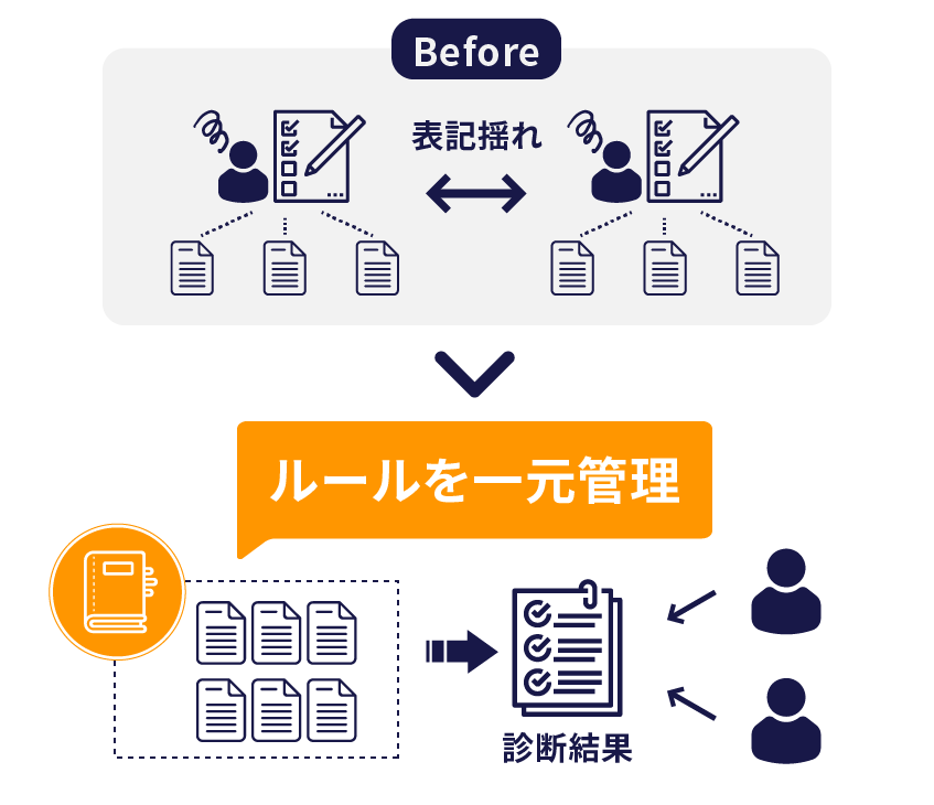 担当者間の表記揺れを防止しつつ、ルール追加時の反映漏れも防ぎます。