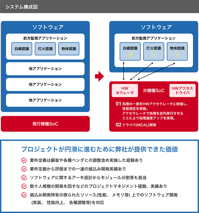 - 処理速度の向上とCPU負荷削減のため、前方監視アプリケーション処理の一部をCPUからHWアクセラレータに移すことを検討
