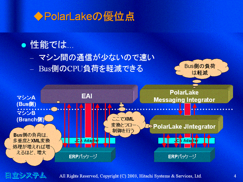 PolarLakeの特長として、中央のBus側とは別にBranch側のERPと同じマシンにPolarLakeを配置するシステム構成が可能であるので、マシン間の通信が少なくなり通信オーバヘッドが軽減され速く、中央のBus側の負荷が軽減され性能を確保できます。また、ライセンスが安価です。