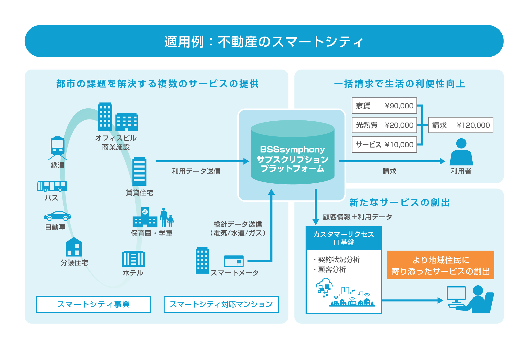 都市の交通や健康などの複数のサービスや、マンションの電気・水道・ガスの使用量に応じて利用料金を家賃とまとめて一本化することで地域住民に生活の利便性を提供します。