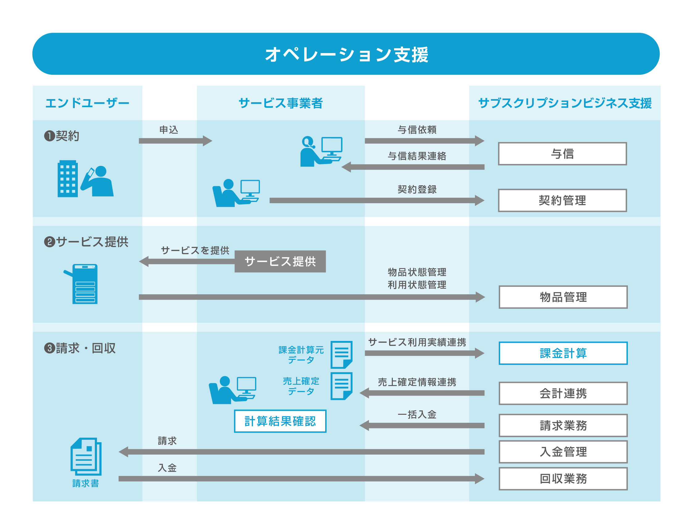 本ソリューションでは運営の要である契約管理業務、請求・回収業務などの業務負荷を削減し、お客さまがサブスクリプションサービスに注力できるサポートをします。