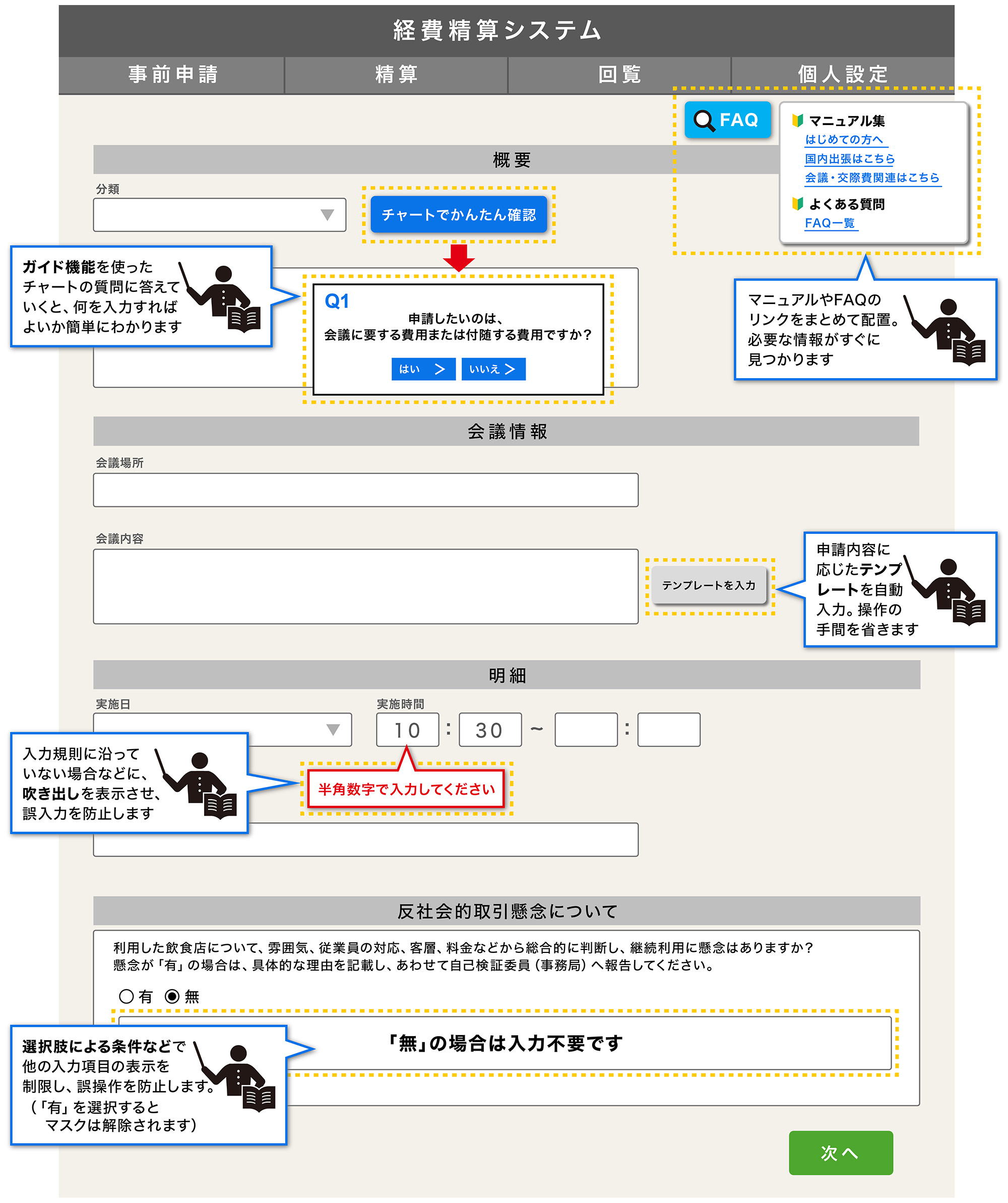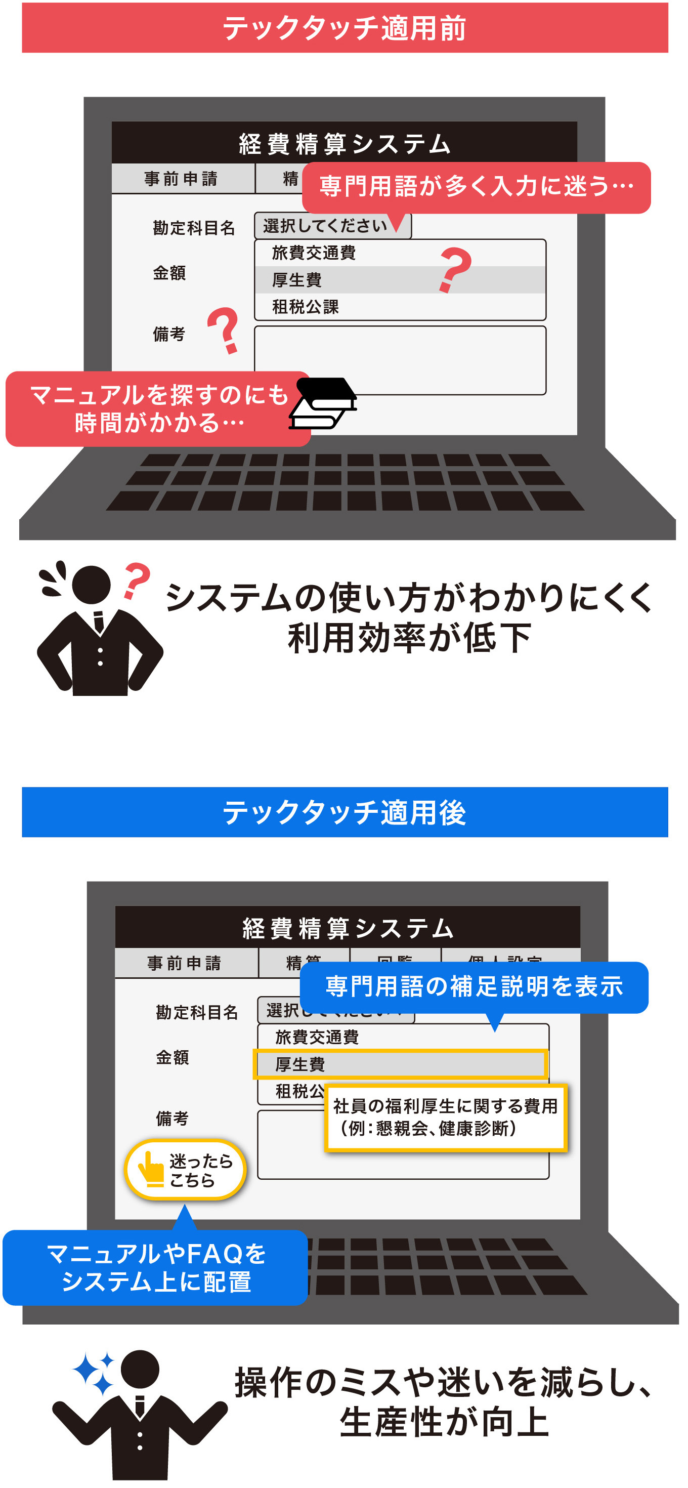経費精算、ERP、人事、SFAなど、従業員が使うさまざまなシステムの誤入力・誤操作を減らし、業務効率化、生産性向上を実現します。