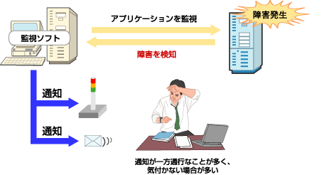 監視ソフトにも「メール通知」や「信号灯通知」の機能を有するソフトがあります。しかしながら、通知は一方通行であることが多いです。もし、通知を受信する担当者が不在であったり、通知に気付かなかった場合・・・、せっかく監視していても障害情報が放置され問題になっています。