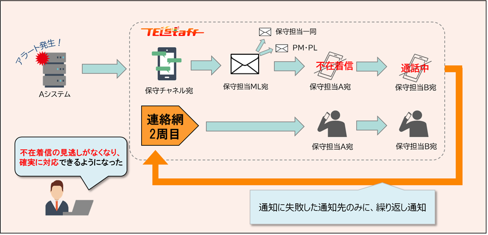 電話で通知を受けた担当が通知を確認したかどうかを把握できます。 応答を確認できない場合、別の担当者に通知することで、通知の見落としや通知不可状態による対応の遅れを防止できます。