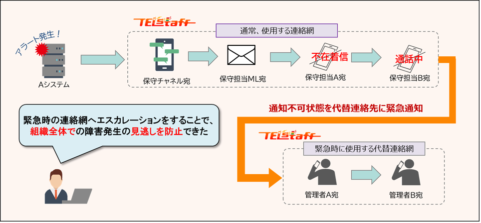 通知できなかった通知先、に対して、通知を繰り返し、障害の発生を誰も認識していないという事態を防止します。