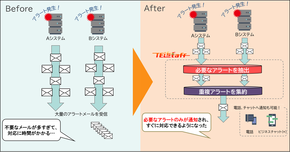 オンプレミス版TELstaffの監視機能で異常を検出し、サービス版TELstaffで必要な通知に絞り、自動で通知する仕組みを実現します。