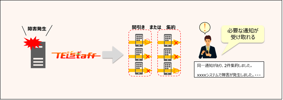 大量発信要求の「間引き」と「集約」を行うことで、一定時間内に同様の通知が行われた場合、後続の通知の実行を抑止することで、ほかの重要な通知の見逃しを防ぎやすくなります。