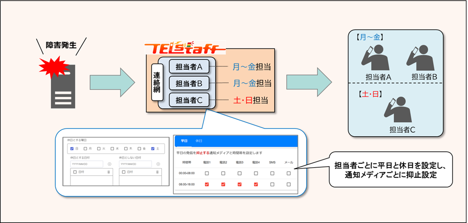 平日・休日など曜日で対応者が異なる場合、通知先の切り替えが必要になったり、当番でない担当者にも通知されることで、手間や精神的な負担がかかります。