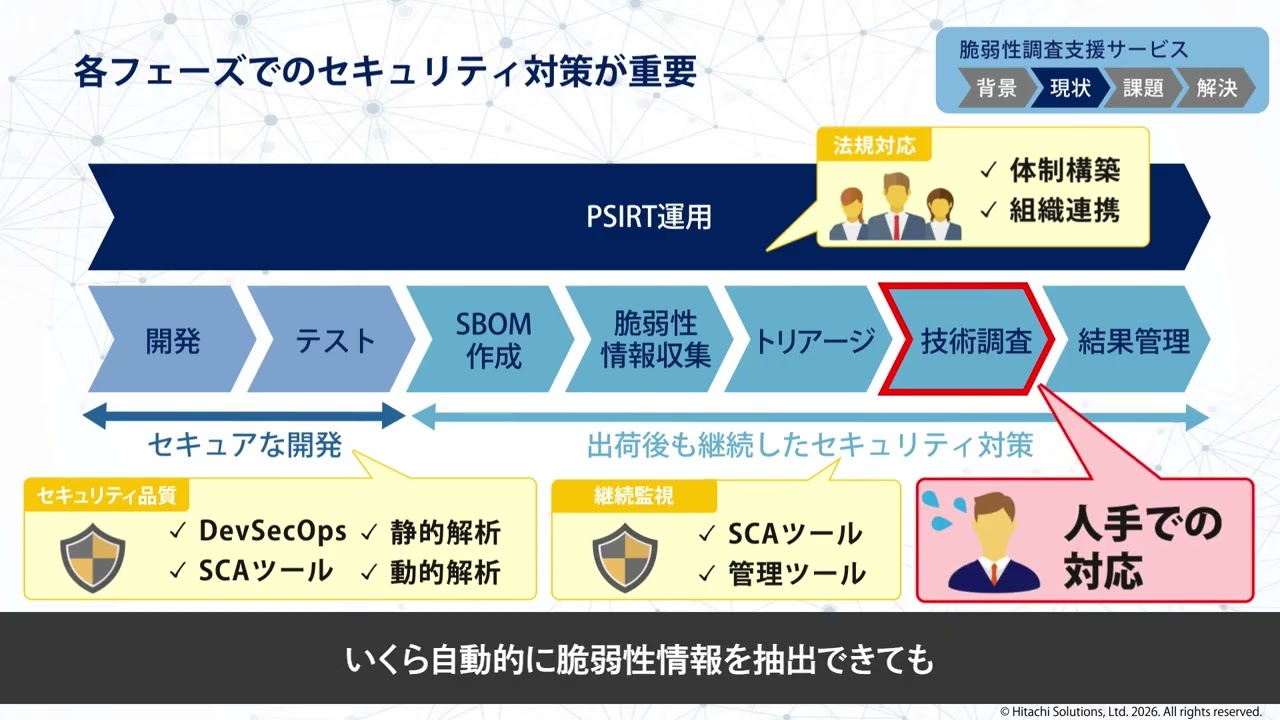 - 開発当時の知見を持つ担当者や、セキュリティに精通した人財が不足しているなか、PSIRT部門からの多数の脆弱性確認依頼への対応に追われ、設計・開発業務にリソースを割くことが困難。