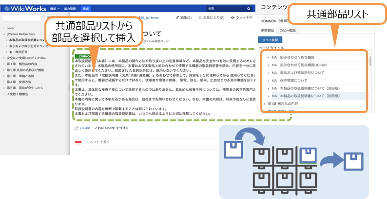 - 既存データを、コンテンツとしてWikiWorks上で一元管理。マニュアル制作時に既存データを活用でき、一貫したドキュメントの制作を支援します。