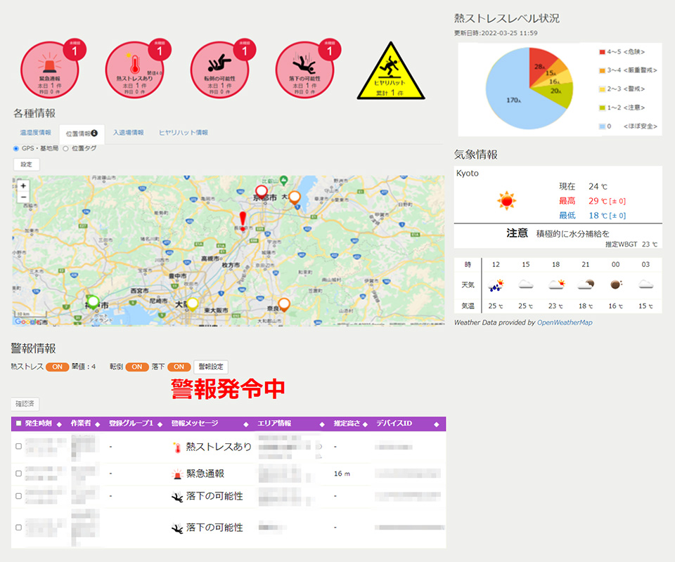 アラートの発報状況をマップ上に表示したり、熱ストレスレベル状況や現場の気象情報などを表示することが可能です。