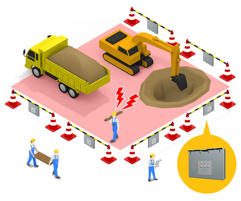 作業者の危険エリアへの侵入を検知し、通知する機能です。専用タグをエリアの境界線に配置することで危険エリアが設定されます。