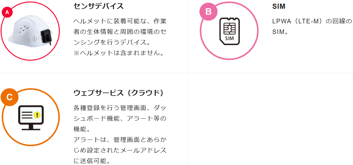 「作業者安全モニタリングシステム」は、ヘルメットに装着可能なセンサデバイスにより作業者の生体情報と周囲の環境情報を計測し、現場監督者や事務所スタッフの方が作業者の安全を遠隔から確認できるシステムです。