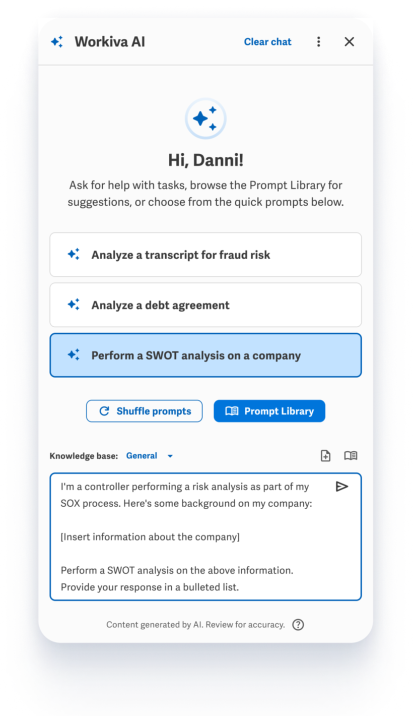 財務・監査・リスク・サステナビリティ業務を支援するAIアシスタントです。レポート作成や要約を効率化し、作業時間を短縮します。入力内容やAIの応答は通信中に暗号化され、安全に取り扱われます。また、お客さまのデータはAIの学習には利用されないため、安心してご利用いただけます。