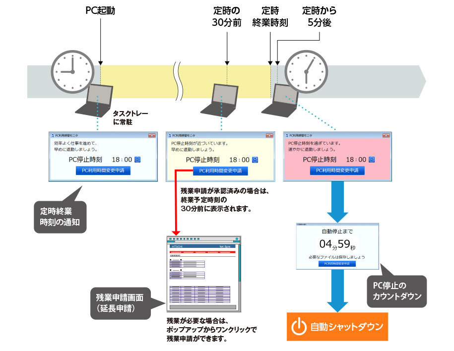 従業員一人ひとりのPC画面にPC停止時刻を定期的にポップアップ表示し、業務終了時刻を意識づけします。定時終業時刻を過ぎるとPC停止のカウントダウン表示が始まり、PCを自動シャットダウンします。
