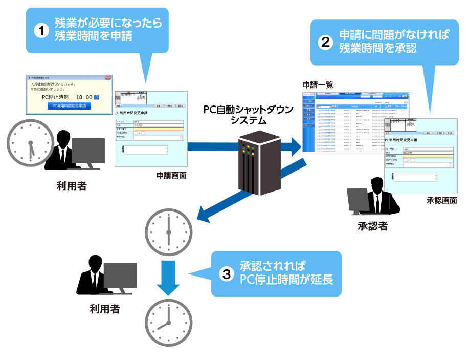 PC自動シャットダウンシステムからの残業申請時に、従業員の労働状況を把握したうえで、承認することができます。また、普段から各従業員の労働状況を把握することができます。