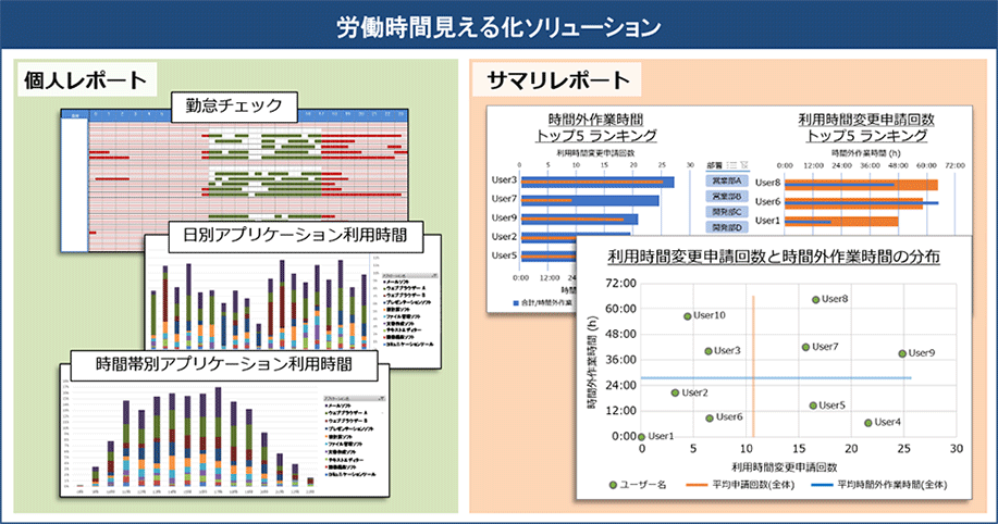 労働時間見える化ソリューションで提供する個人レポートでは使用アプリ時間や勤怠突合せ情報のレポートが可能です。また、サマリレポートではPC自動シャットダウンシステムのログも活用し時間外作業時間と残業申請の状況のレポートが可能です。