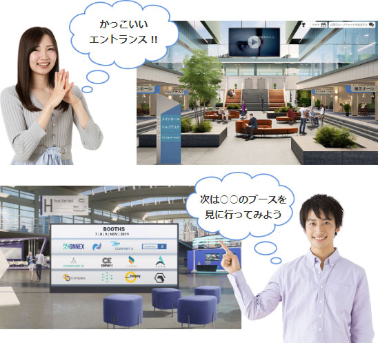 バーチャルイベントとはオンラインの仮想空間で実施するイベントのことで、これまでリアルな会場で開催されていた展示会やセミナー、会社説明会、入社式などの各種式典、といったイベントを、そのままオンライン上で開催できるようになります。