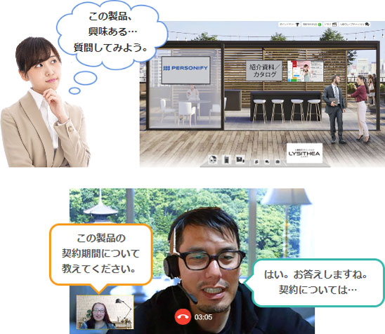「展示ブース」や「ヘルプデスク」にアテンドスタッフを配置。リアルタイムで参加者からの質問にチャットやビデオ通話で対応。